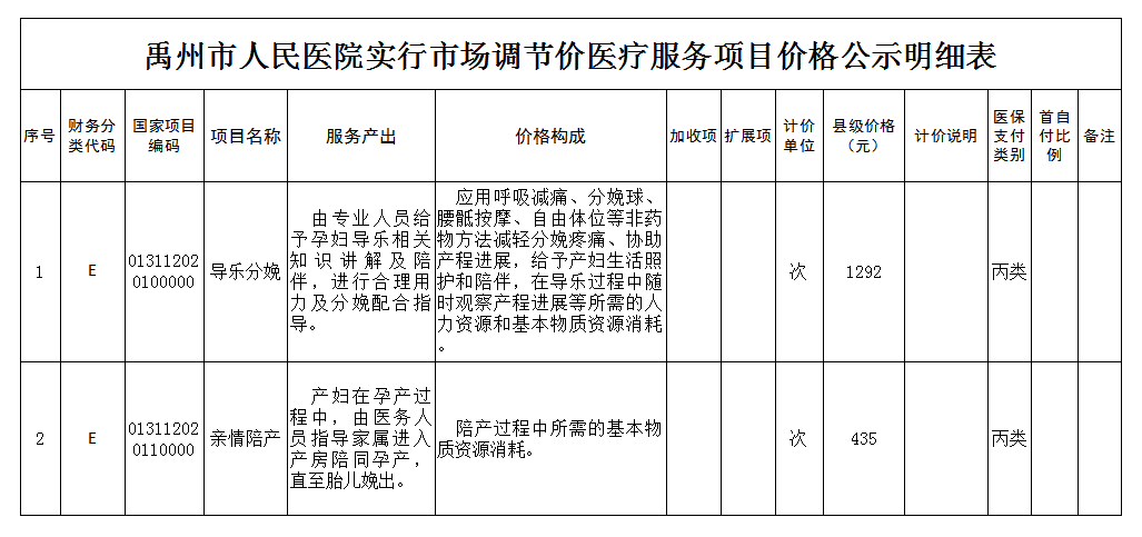 为缓解产妇分娩疼痛焦虑,增进亲子情感联结,进一步提升产科服务质量,满足人民群众就医需求。根据《河南省医疗保障局河南省卫生健康委员会关于进一步做好新增医疗服务价格项目管理工作的通知》(豫医保〔2019〕3号)、《许昌市医疗保障局 许昌市人力资源和社会保障局关于规范整合产科、中医等4类医疗服务价格项目的通知》(许医保〔2025〕7号)文件精神,我院拟开展两项实行市场调节价医疗服务项目,特进行相关项目价格公示。