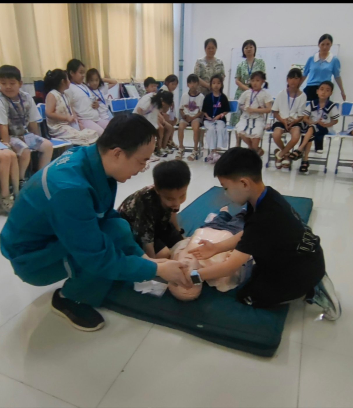 孩子们在医生的指导下练习心肺复苏术